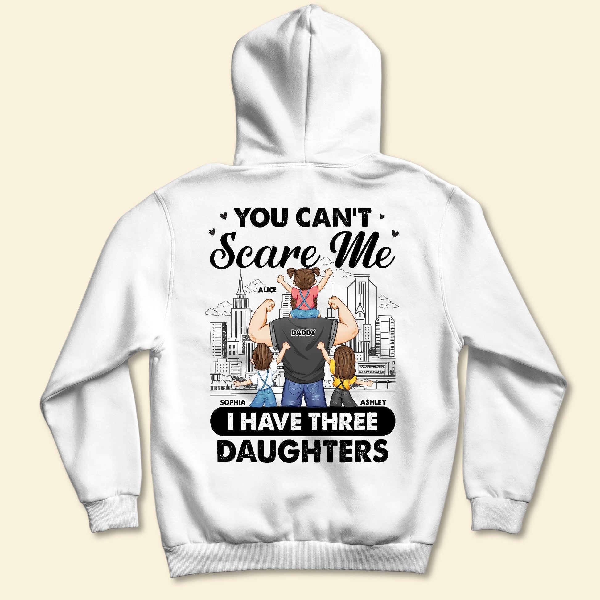 Get ready to turn heads and chuckle with our Personalized Back Printed Shirt, the ultimate defense against any scare tactics! Featuring the hilarious phrase "You Can't Scare Me, I have..." followed by your choice of "Daughters," "Son," or "Children," this shirt is sure to elicit laughs and knowing nods from fellow parents. Customize the characters to depict Dad and up to five kids, adding a personal touch that's as unique as your family dynamic. Whether it's Father's Day, Christmas, his birthday, or just because, this shirt is more than just a gift – it's a humorous declaration of Dad's fearless parenting prowess. Imagine the smiles and giggles as Dad proudly sports his shirt, ready to face any challenge with his trusty sidekicks by his side. Don't miss the chance to add a dash of humor to Dad's wardrobe – order this personalized shirt today and let the laughter begin!