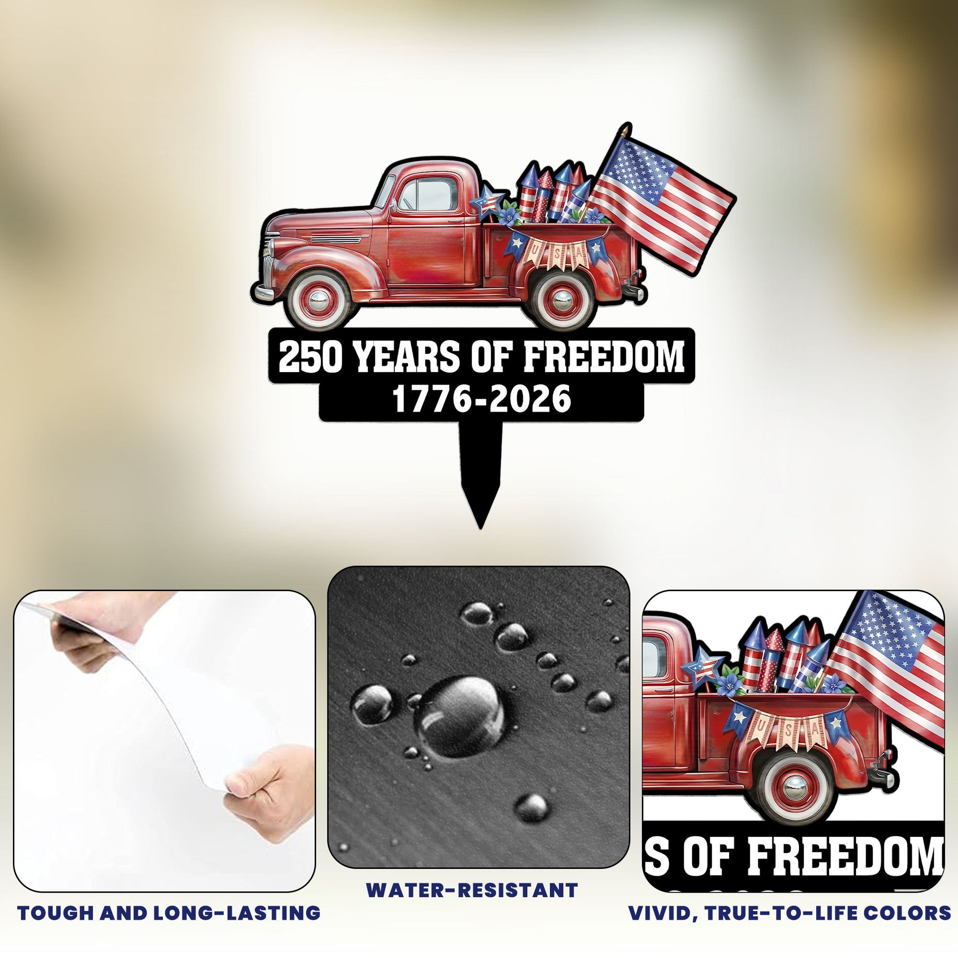 Celebrate a momentous milestone with our 250 Years Of Freedom Red Truck Tractor Garden Decor. This personalized product is more than just a garden stake, it's a symbol of intimate family ties and enduring American spirit. Crafted from printed metal and designed to weather any storm, this delightful ornament adds a touch of patriotism and nostalgia to any garden. It connotes a lovely sense of bonding and resemblance, making it a truly unique piece. Perfect for Independence Day celebrations, birthdays, anniversaries, or just about any special occasion, this garden stake holds a powerful message of freedom and longevity.