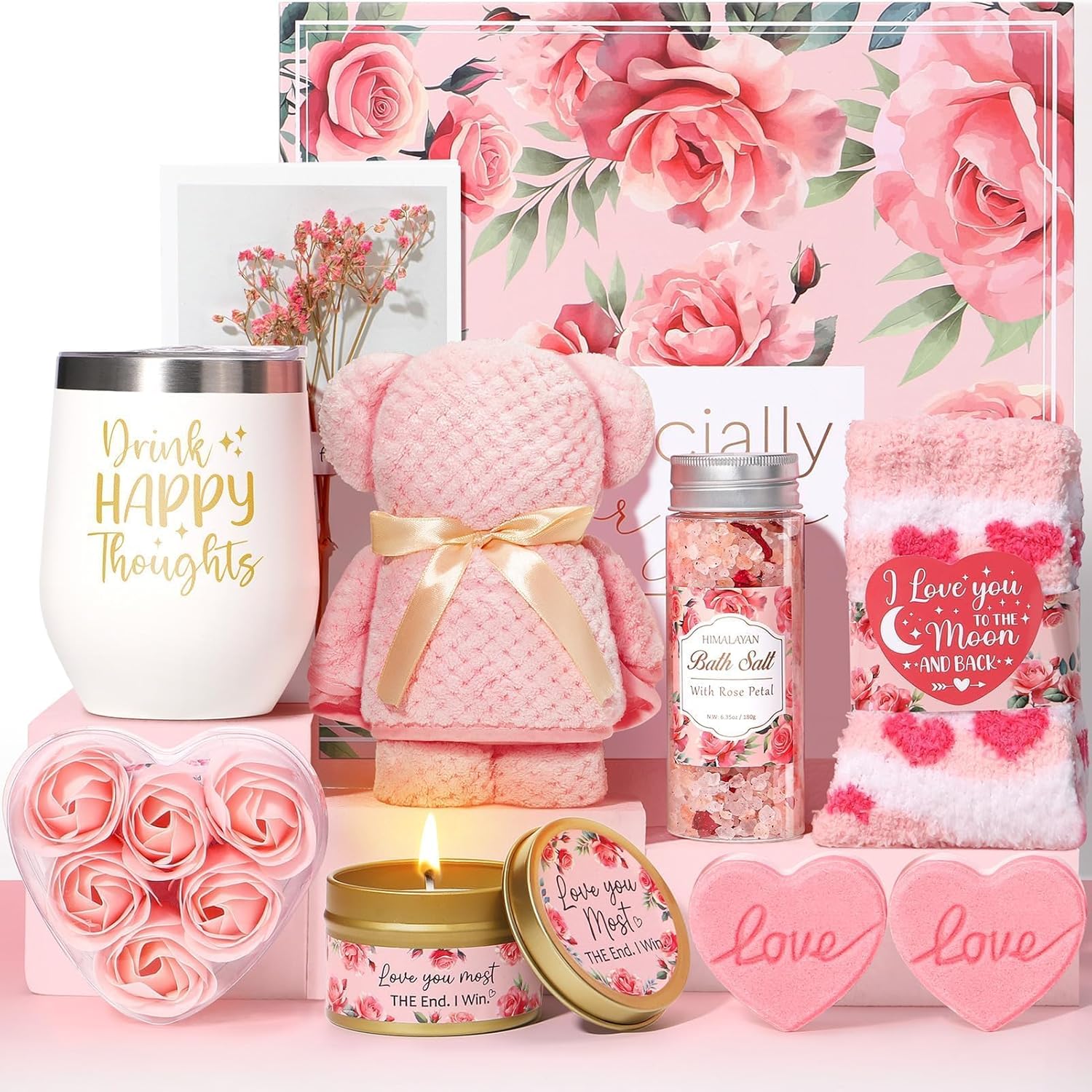 - Romantic Design: Pink-themed packaging, bear-shaped towel, and “Drink Happy Thoughts” tumbler inspire joy and relaxation.
