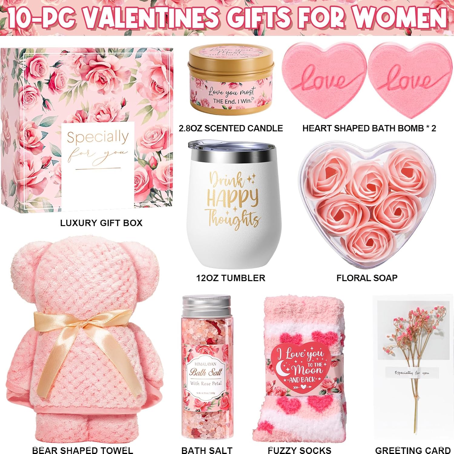 - 10-Piece Luxury Spa Set: Includes bear-shaped coral fleece towel, 12oz stainless steel tumbler, rose-scented soy candle, Himalayan bath salt, 2 heart-shaped bath bombs, floral soap, fuzzy socks, gift card, and elegant gift box.