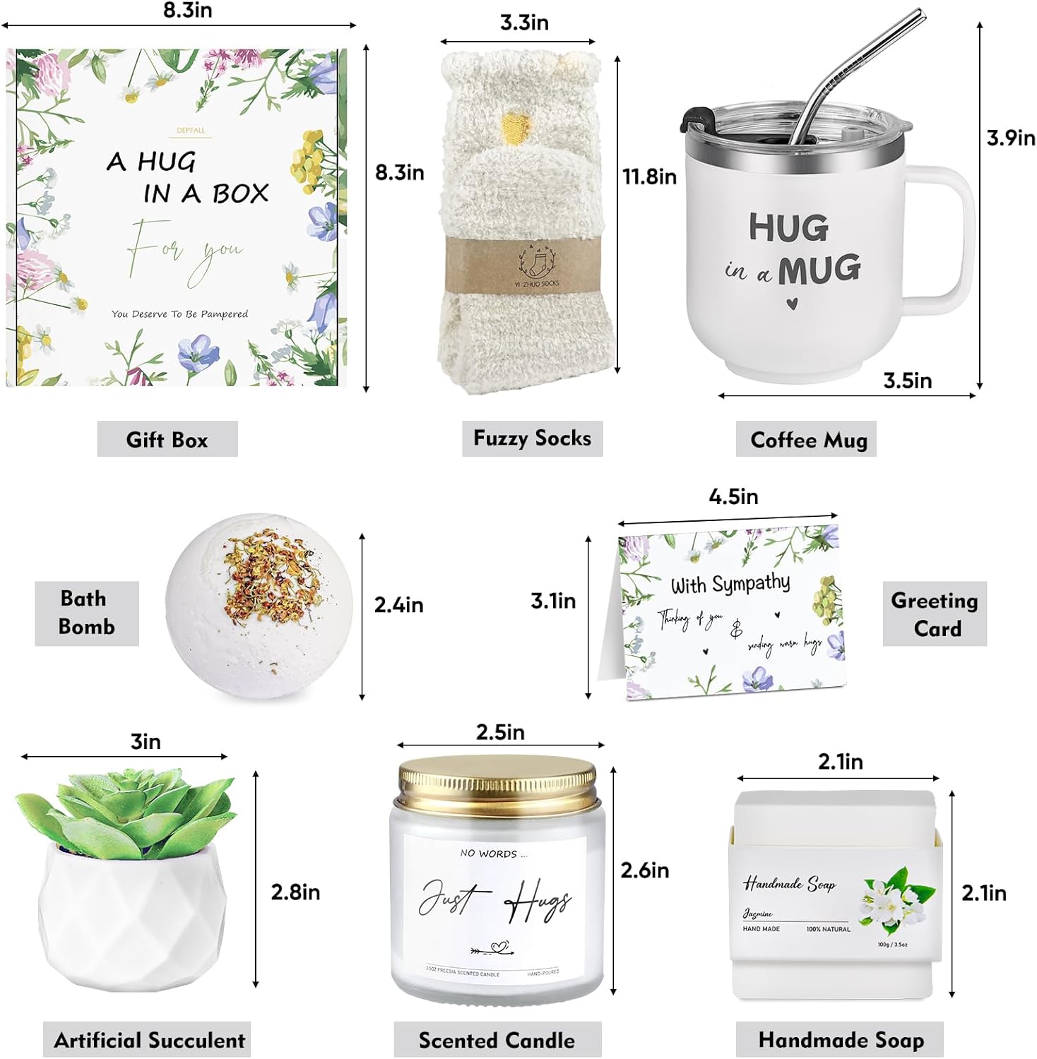 - 8-Piece Healing Collection: Includes insulated coffee mug, freesia-scented candle, milk bath bomb, jasmine soap, fuzzy socks, artificial succulent, sympathy card, and reusable gift box.